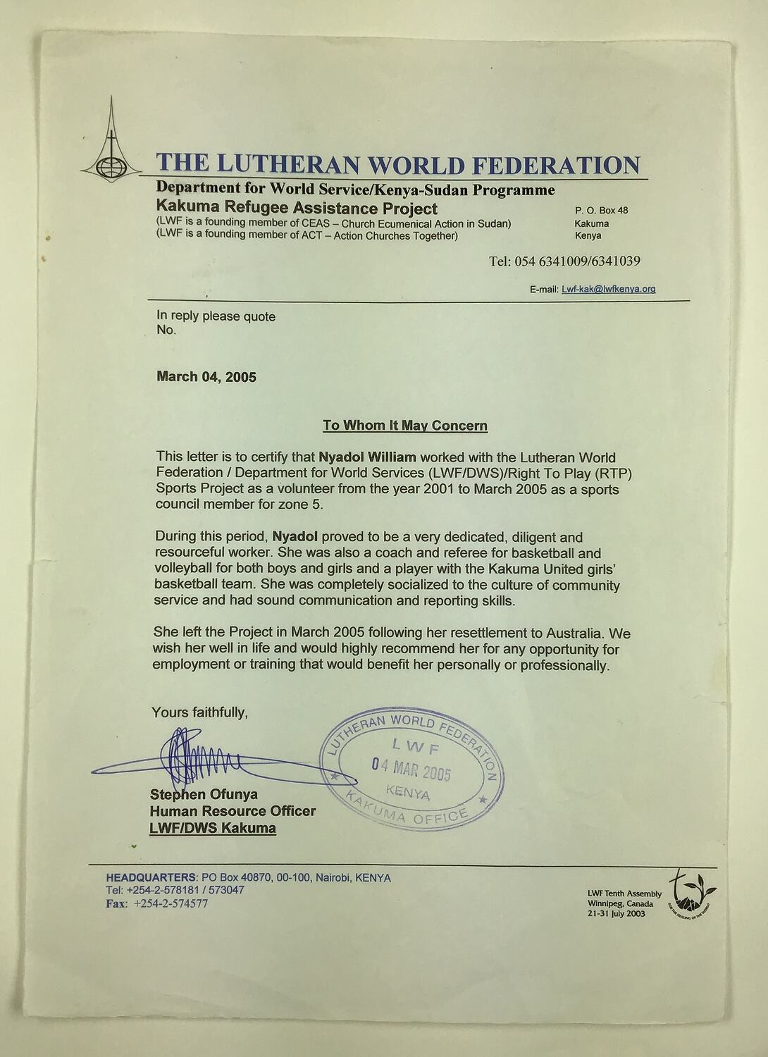 Letter of recommendation from the Lutheran World Federation, Kakuma Refugee Assistance Project, certifying that Nyadol William Nyuon worked with the Federation Right to Play Sports Project as a volunteer, dated 4 March 2005.