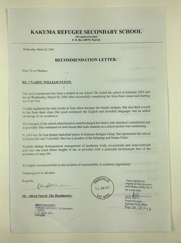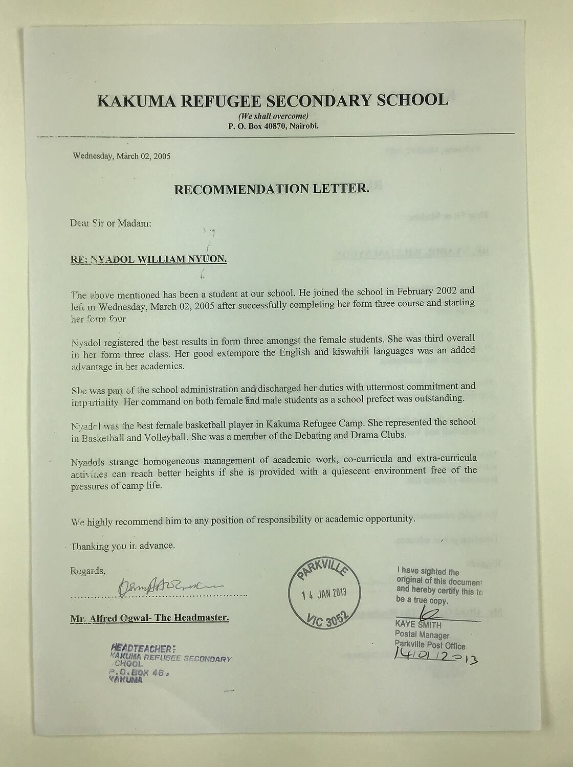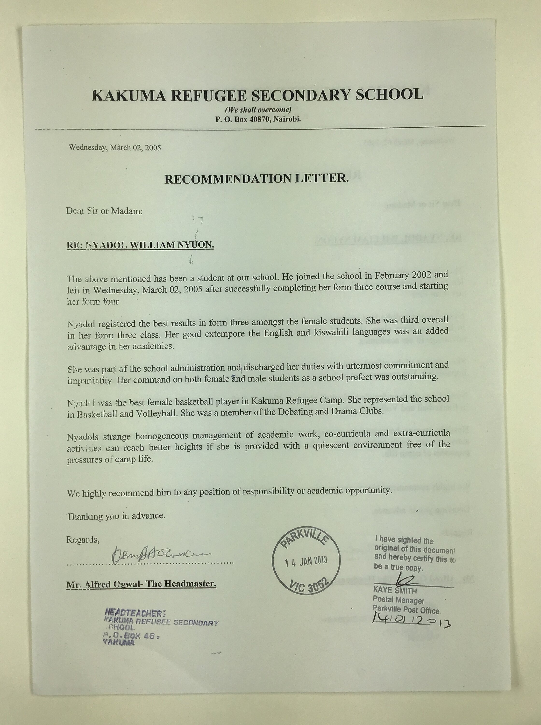 Letter of recommendation for Nyadol William Nyuon from Kakuma Refugee Secondary School, Nyadol William Nyuon, 14 January 2013.