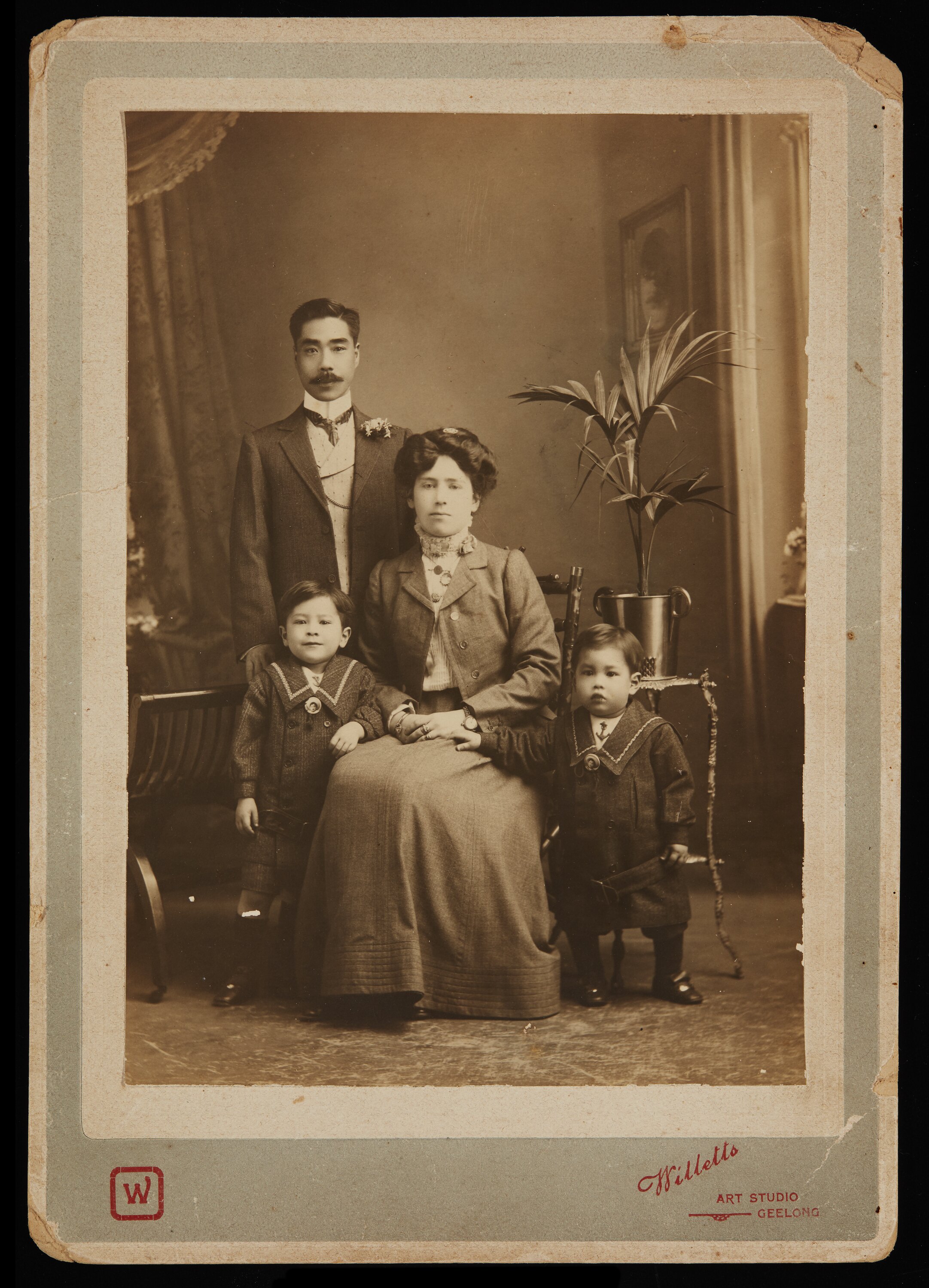 Sepia photographic portrait of Setsutaro Hasegawa with his wife Ada and two sons, Leo Takeshi and Moto Kozo (later Jack Cole), Melbourne, circa 1910.
