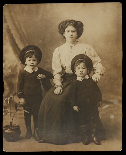 Sepia photographic portrait of Ada Hasegawa (nee Cole) and two sons, Leo Takeshi and Moto Kozo (later Jack Cole), Melbourne, circa 1910. Ada married Japanese migrant Setsutaro Hasegawa in 1905; they separated circa 1914.