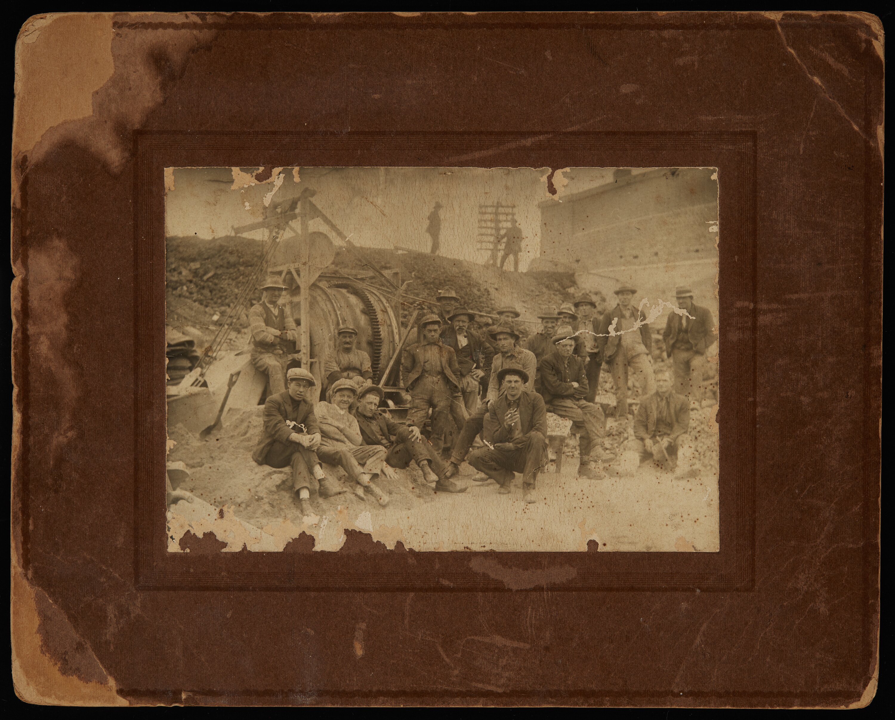 Sepia photograph of Moto Kozo (Later Jack Cole) at centre, on an identified construction site in Sunshine, Victoria, 1930s according to the family. Moto was the son of Setsutaro and Ada Hasegawa.