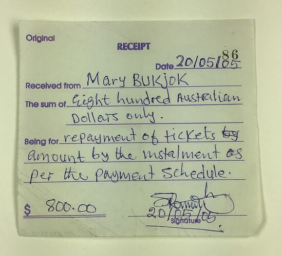 One of 10 loan repayment receipts (stapled together) from Mary Jock Bukjock (Nyadol Nyuon's mother) from 2/5/2005 to 17/3/2006 recording repayments for the costs of airfares for the Nyuon family to fly to Australia. Nyadol's family was sponsored to migrate through Australia's Family Reunion Scheme; an uncle in the United States loaned funds to pay for required medicals, and the airfare costs were loaned by a community member in Melbourne.