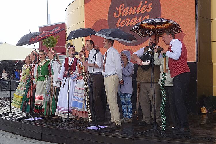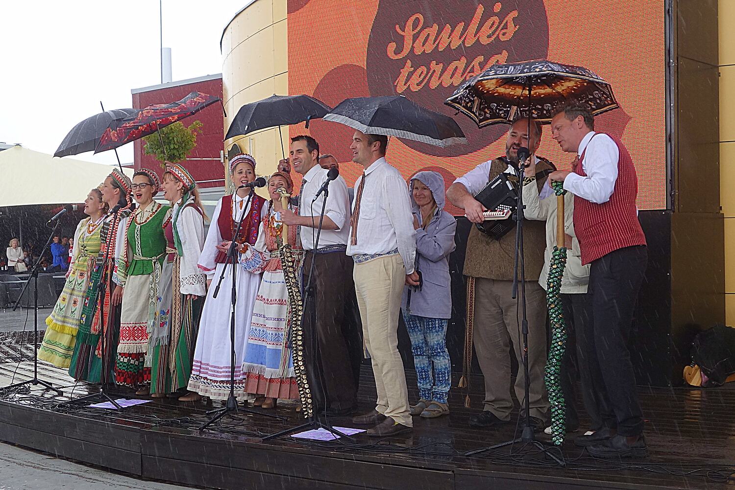 Digital colour photograph of members of The Lost Clog Melbourne-Lithuanian folk ensemble performing on an outdoor stage at the Saules Ziedas International Song Festival, Lithuania, 2015. Wearing traditional Lithuanian regional costumes and singing Lithuanian songs, the ensemble represented Australia. Jazmina Cininas, maker of the lagerphones featured in the photograph is fourth from the left. The photograph was taken by (name withheld).