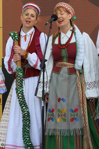 Digital colour photograph of two members of The Lost Clog Melbourne-Lithuanian folk ensemble performing on an outdoor stage at the Saules Ziedas International Song Festival, Lithuania, 2015. Wearing traditional Lithuanian regional costumes and singing Lithuanian songs, the choir represented Australia. Jazmina Cininas, maker of the lagerphone featured in the photograph is on the right. The photograph was taken by (name withheld).