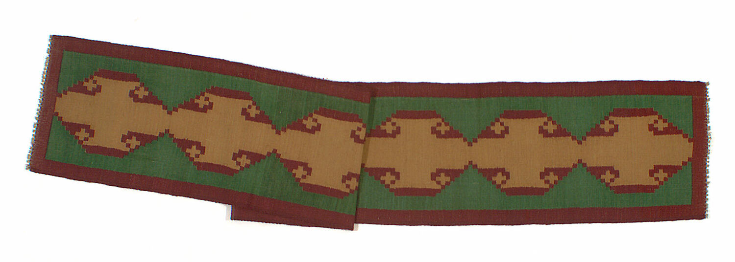 Long narrow woven hall runner with red border and fringing at each end. The rug has a repeating geometric pattern in red and tan on a green background.