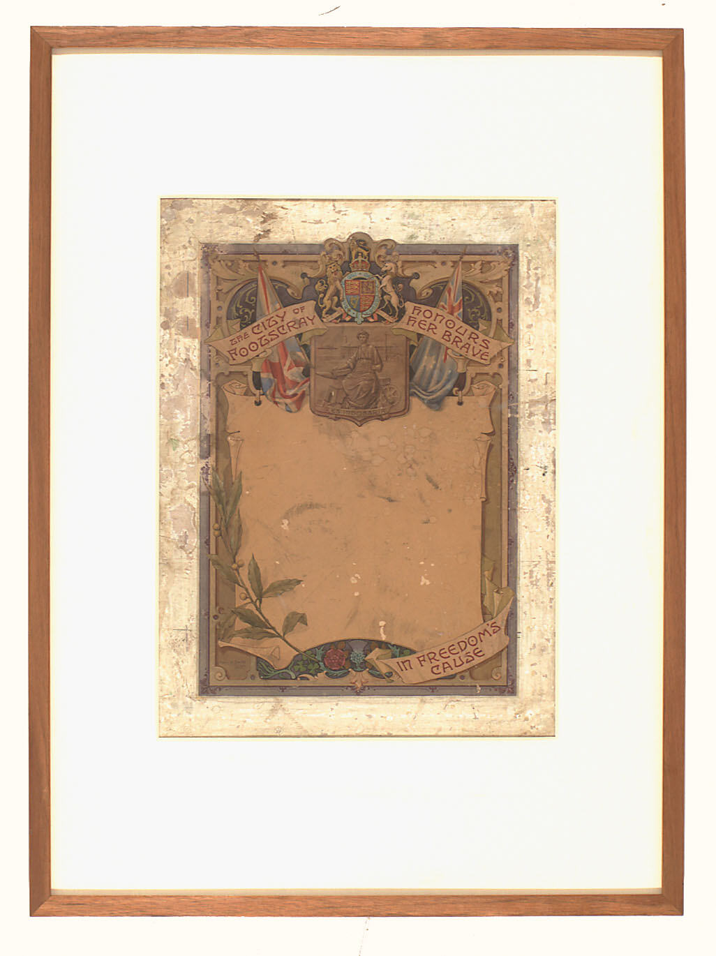 Original artwork designed by Cecil G. Smith for a certificate to be awarded to individuals from Footscray who enlisted in the Great War, 1914-1918 Made by D.W. Patterson Co. Pty Ltd, circa 1917-1922.