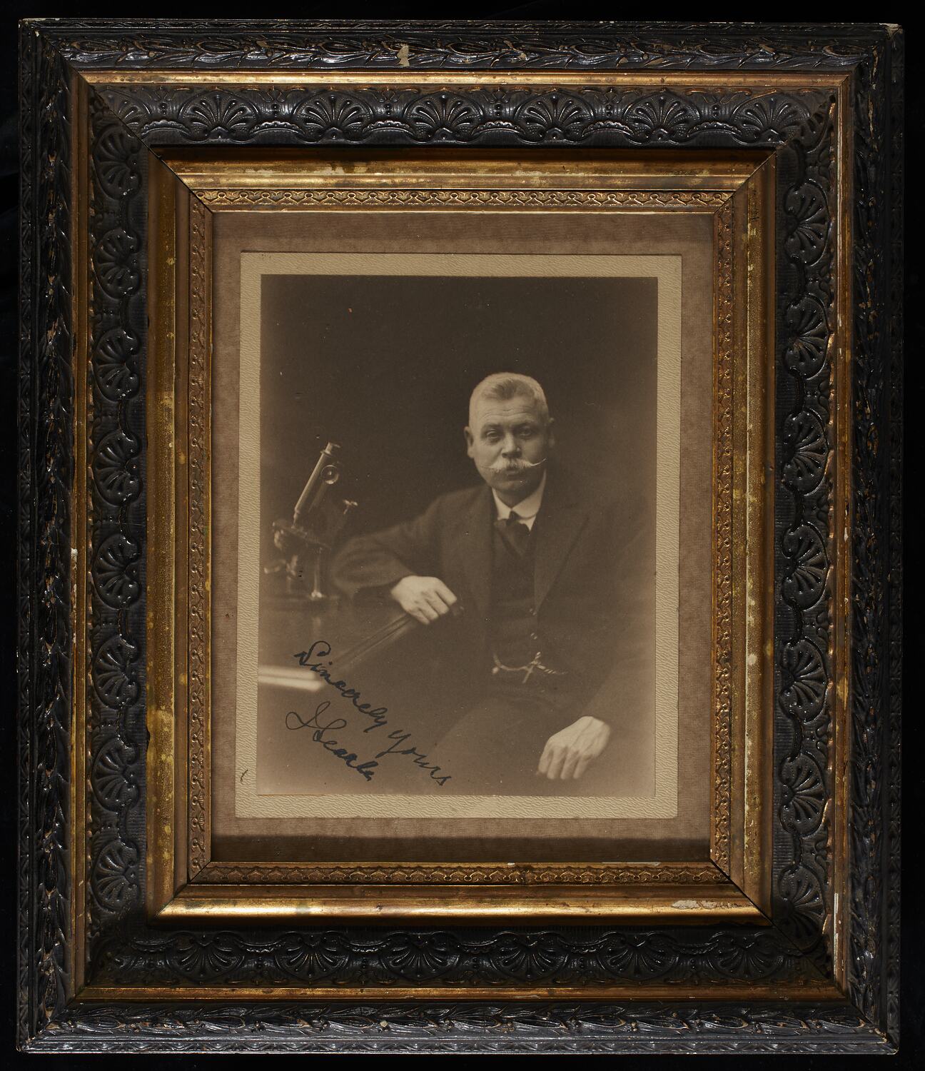 Framed formal portrait of James Michael Searle (4 Nov 1861 - 9 Sep 1947), who was a keen member of the Field Naturalists' Club of Victoria for over 60 years. Professionally he worked as a scientific instrument and watch maker and was one of the first people to manufacture magic lantern slides in Melbourne. His skills also extended to the role of 'limelight artist' presenting numerous magic lantern shows of slides to accompany public lectures, talks and presentations on scientific subjects, religion, history, travel and social issues in Melbourne, regional Victorian towns and interstate. Searle was a strong supporter of both the National Museum of Victoria and the Industrial &Technological Musuem, presenting both organisations with many specimens collected on his own field trips and a range of historical artefacts relating to firearms, horology, photography, phonographs, electricity and lighting.