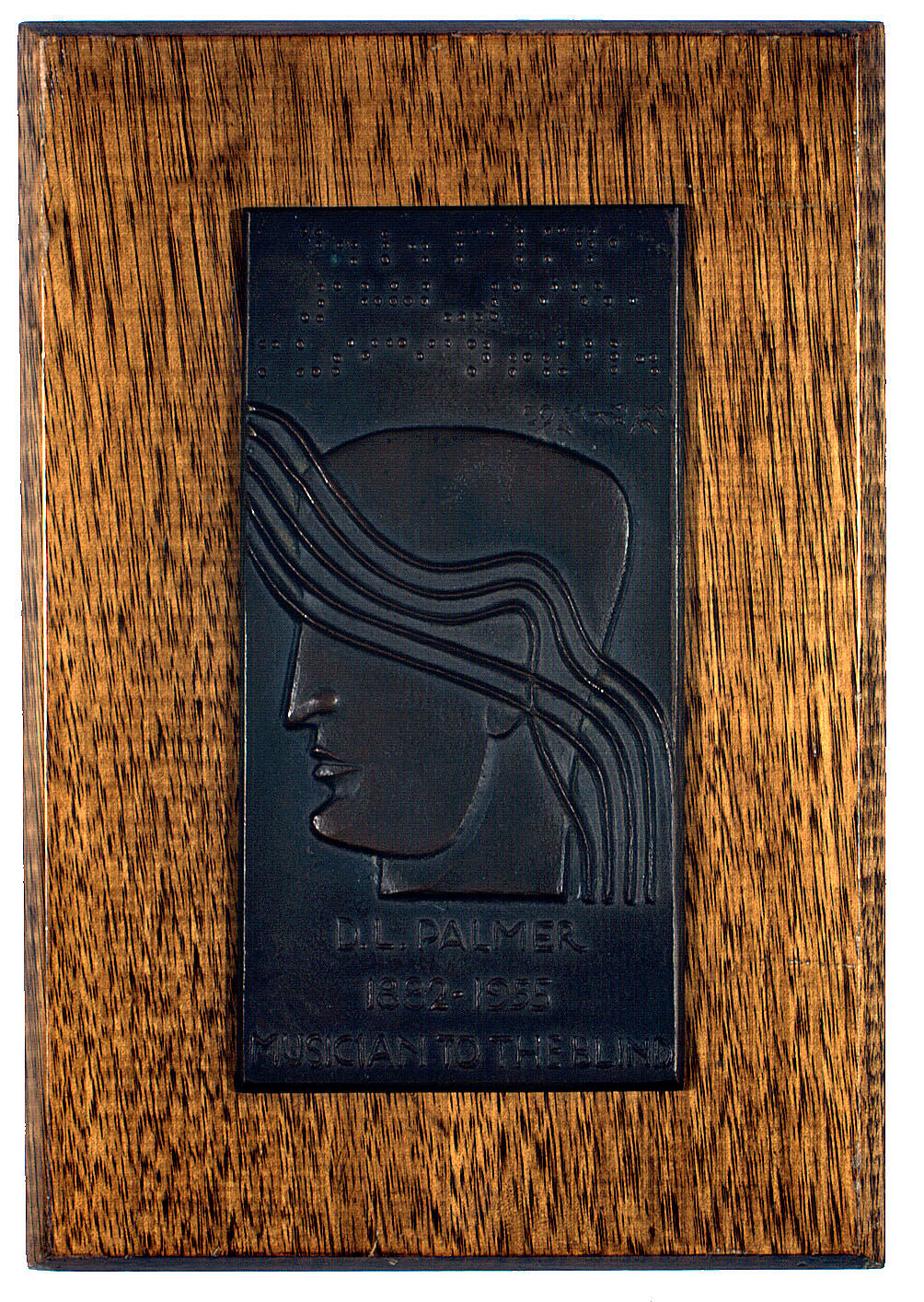 Copper plaque mounted on wooden block, dedicated to D.L. Palmer, 1882-1955, Musician to the Blind. There is quite a striking design of a head in profile with wavy lines across it, raised, and above this the inscription in Braille. Indecipherable markings at top, could be signature of the artist.