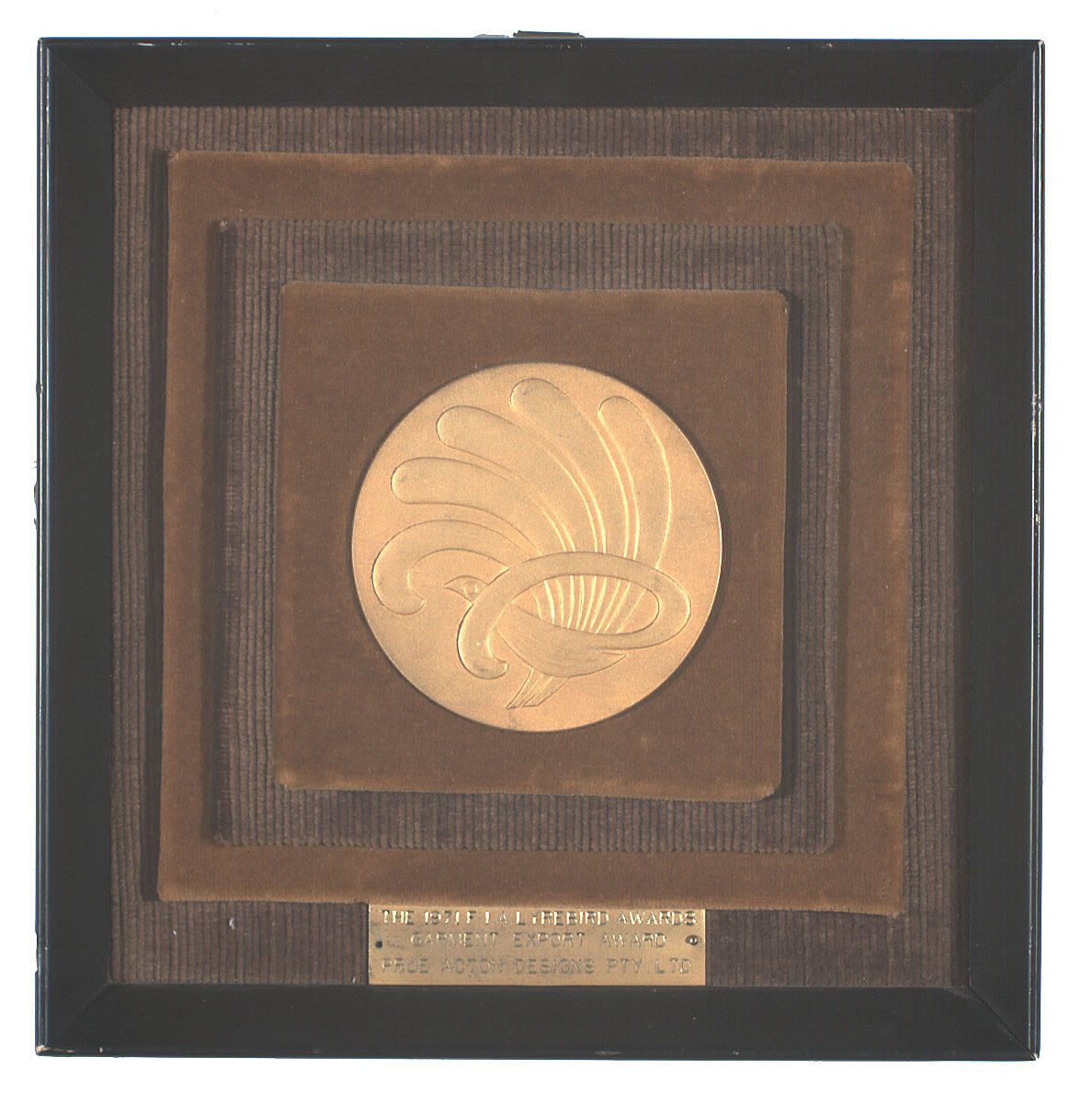 Engraved into brass plate on front: THE 1971 F.I.A. LYREBIRD AWARDS/ GARMENT EXPORT AWARD/ PRUE ACTON DESIGNS PTY LTD