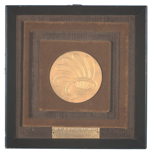 Unglazed framed gold metal Lyrebird medallion mounted on brown velvet.An inscribed brass plate is attached to the lower centre edge of mount. The frame is square and painted black.