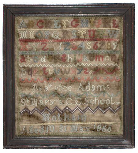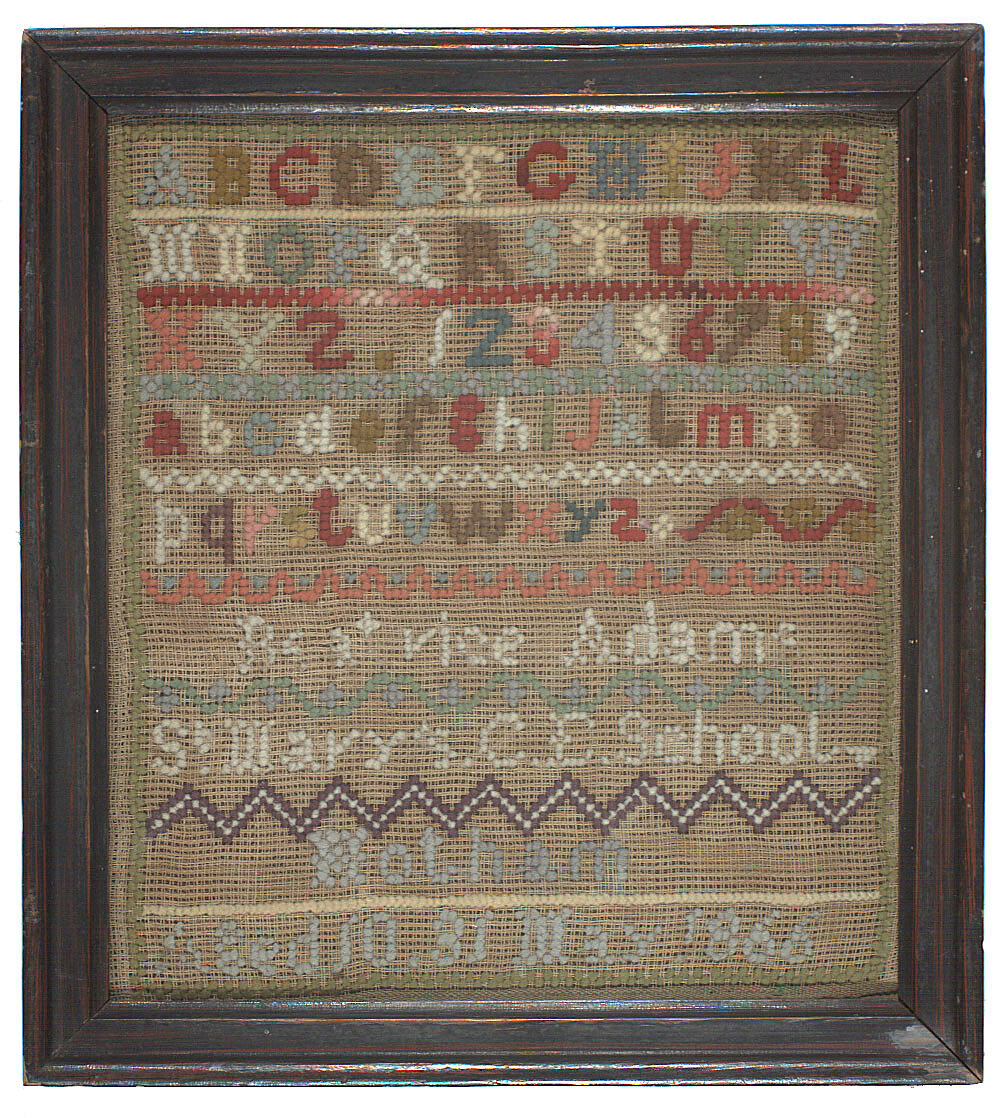 Inscribed in wool: 'ABCDEFGHIJKL / MNOPQRSTUVW / XYZ.123456789 / abcdefghijklmno / pqrstuvwxyz / Beatrice Adams / St Mary's C.E. School / Hotham / Aged 10 31 May 1866'.