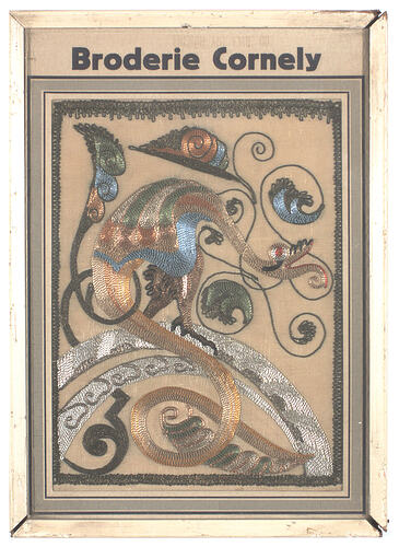 Embroidery sample designed and manufactured in France by Broderie Cornely. The sample was framed and used as decoration at Prue Acton P/L in Melbourne. Broderie Cornely embroidery featured in some of Prue Acton's designs.