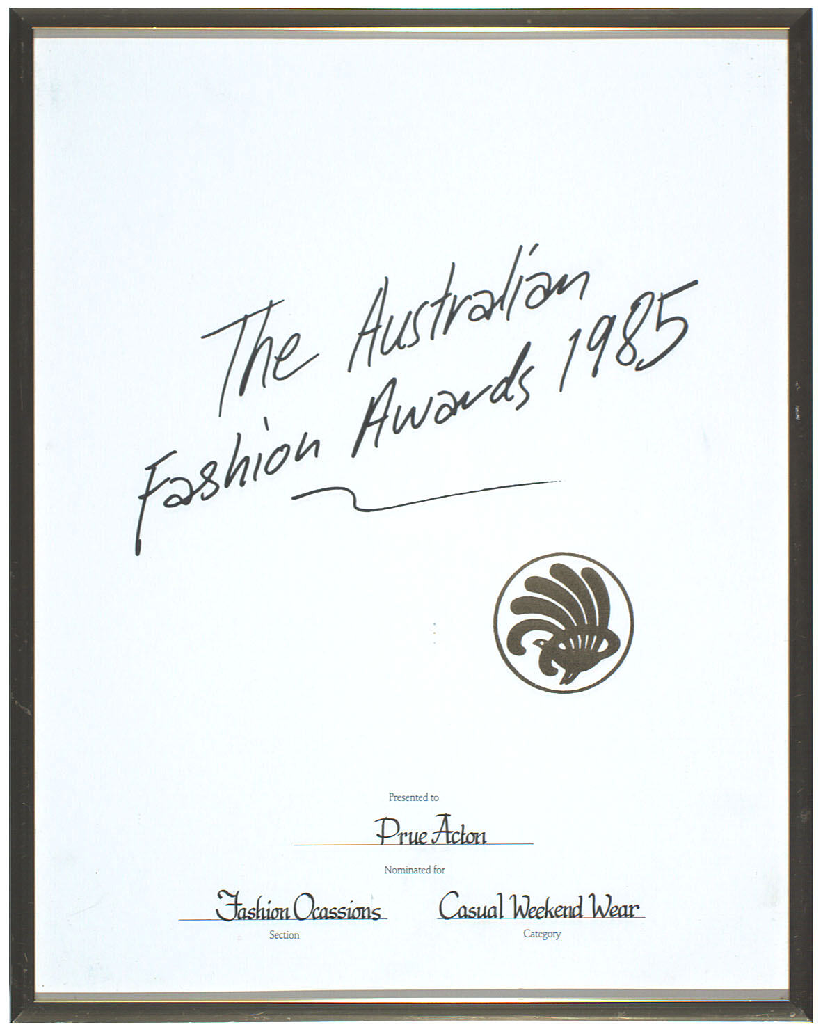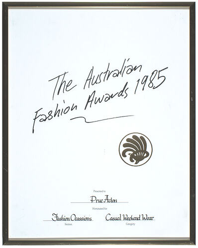 Black text printed on front: The Australian/ Fashion Awards 1985/ presented to / PRUE ACTON (handwritten)/ Nominated for/ Fashion Occasions (handwritten)/ Section/ Casual Weekend Wear (handwritten)/ Category