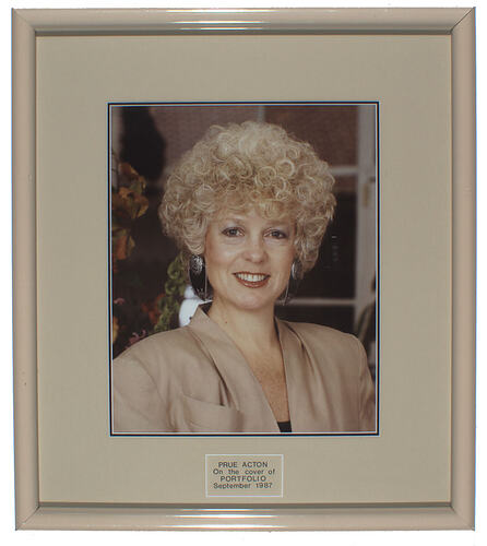 Framed photograph of fashion designer Prue Acton wearing large black and silver earrings and a beige jacket, taken in 1987. The image was used for the front cover of "Portfolio' Working Woman's Magazine", September 1987. Inside the magazine was an article on Prue Acton entitled "The Shirley Temple of Australia's Rag Trade" (p.14-16.)