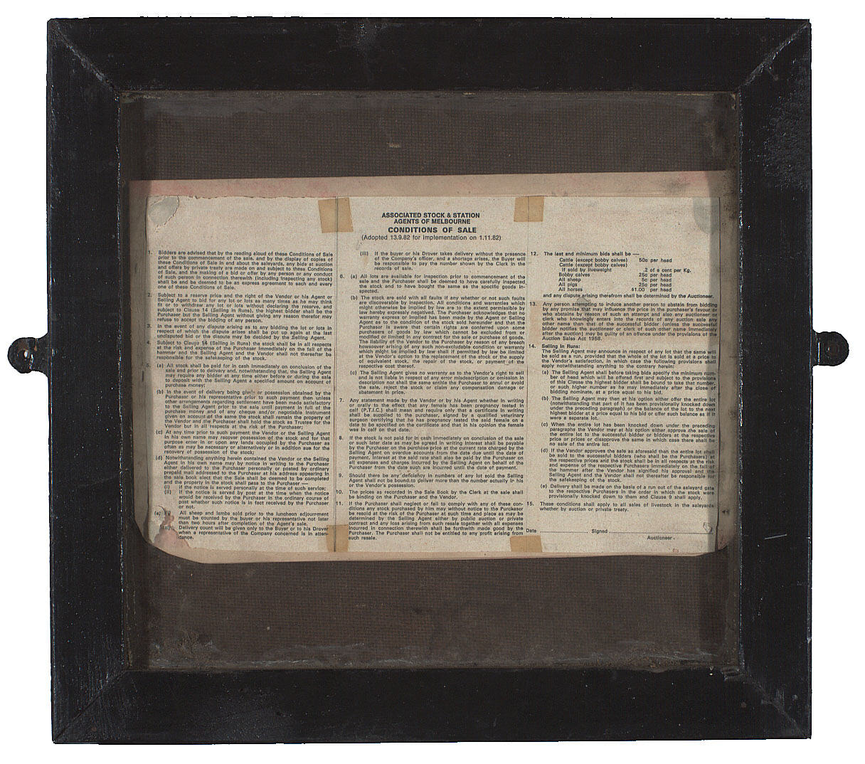 Framed notice - Associated Stock and Station Agents of Melbourne Conditions of Sale for implementation 1st November 1982. Hung outside the Council Administration Office at the Newmarket Saleyards.