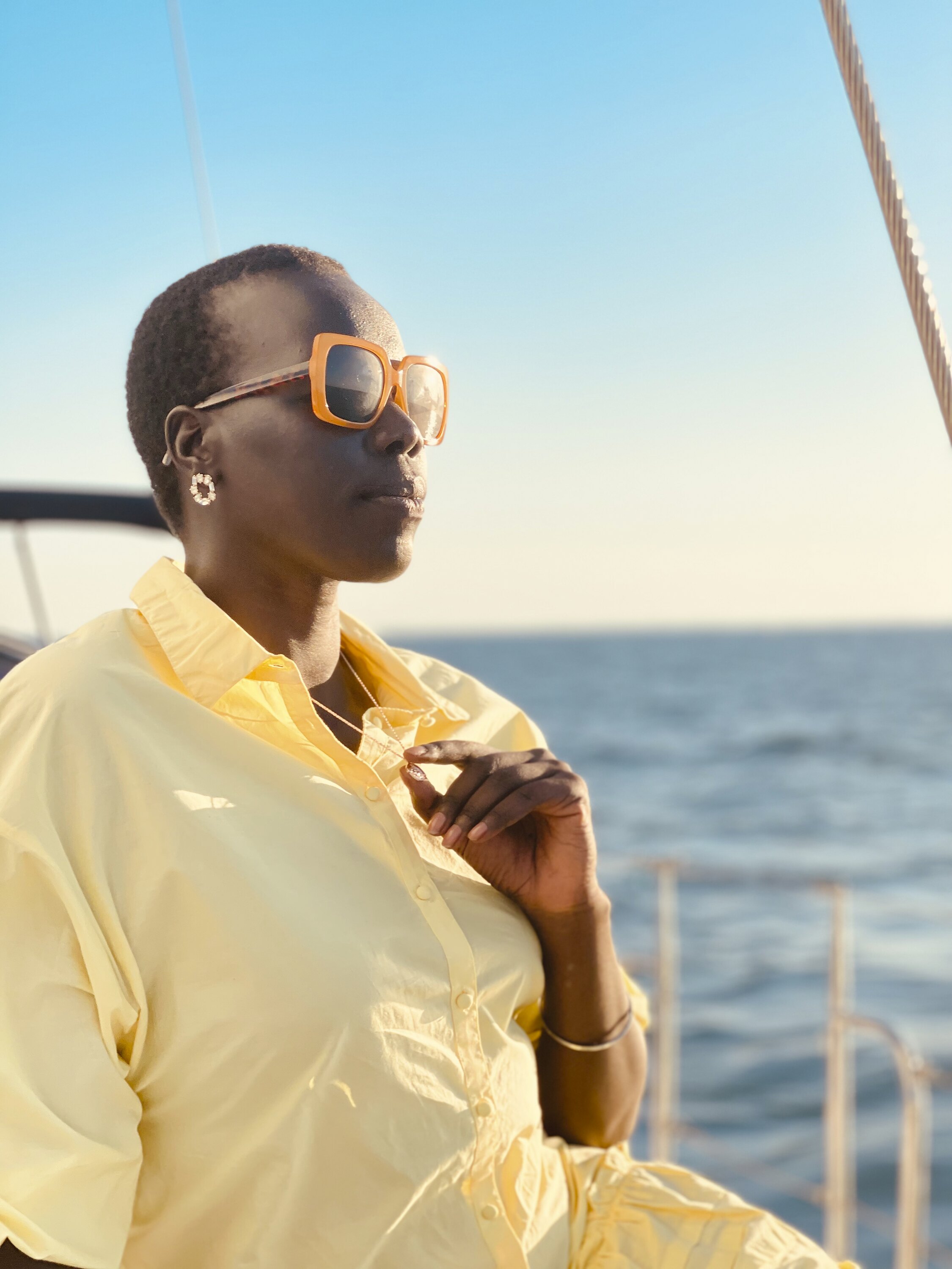Digital photographic portrait of Nyadol Nyuon taken by a friend during a boat trip with friends off the Mornington Peninsula, 3 April, 2021.