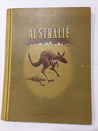 Hardcover large format book entitled 'Australie' published in the Netherlands by Uitgave Van Douwe Egberts N.V. Joure, Utrecht, circa 1950s (undated). It contains text in Dutch and mounted colour illustrations and presents a typical for the time introduction about Australian history, including: Dutch explorers, economy, landscape, industry, cities, sport and wildlife, all aimed at Dutch tourists and migrants. It appears to be part of a series of folios by Douwe Egberts and redeemable via coupons (there are still some inserted in the book).