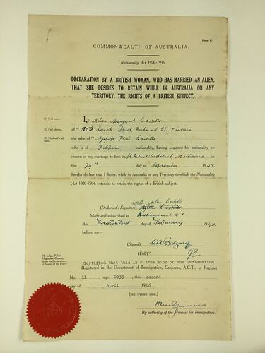 Declaration certificate for Aileen Castillo to retain the rights of a British subject having 'married an alien' on 24 September, 1945. The document is certified 2 April 1946.