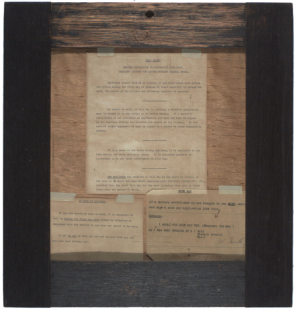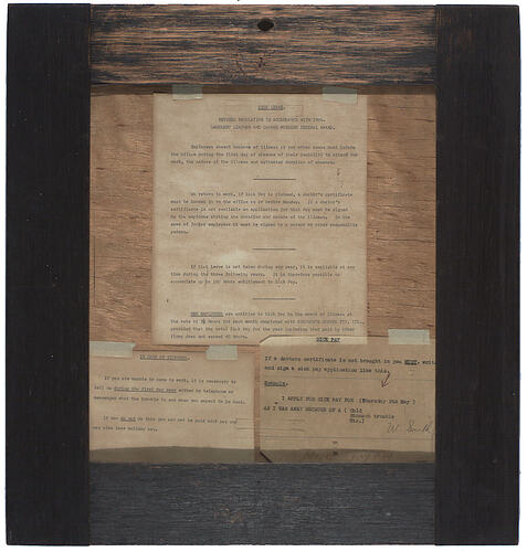 Wooden framed notice board with three notices relating to sick leave, Simpson's Gloves Pty Ltd, Richmond, circa 1956.