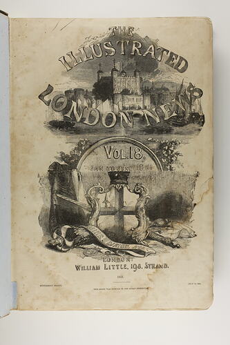 Bound volume, hardcover, Illustrated London News, Vol.18, January to June 1851. Weekly illustrated newspaper. At the front, an index to engravings and articles within. From page 359 to 374, information regarding the Great Exhibition, London, with references to Australian exhibits. There are also general engravings showing aspects of the Exhibition.