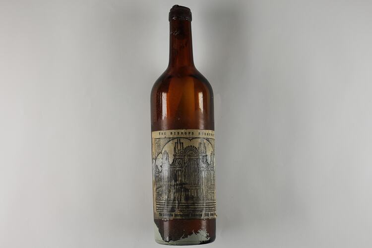 On label: THE BISHOPS BURGUNDY / The Melbourne International Exhibition (1880) Grand Organ. Bottom of bottle: ISM 599