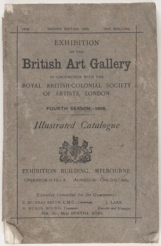 Front cover: 1908 SECOND EDITION 7000 ONE SHILLING; EXHIBITION / OF THE / British Art Gallery / IN CONJUNCTION WITH THE / ROYAL BRITISH-COLONIAL SOCIETY/ OF ARTISTS, LONDON / FOURTH SEASON-1908 / Illustrated Catalogue; EXHIBITION BUILDING, MELBOURNE/ OPEN FROM 10 TILL 5. ADMISSION-ONE SHILLING.; Executive Committee for the Guarantors:/ R. MURRAY SMITH, C.M.G., Chairman. J. LAKE,/ H. BYRON MOORE, Treasurer. Director and Manager./ Hon. Sec., MISS BERTHA BORS.