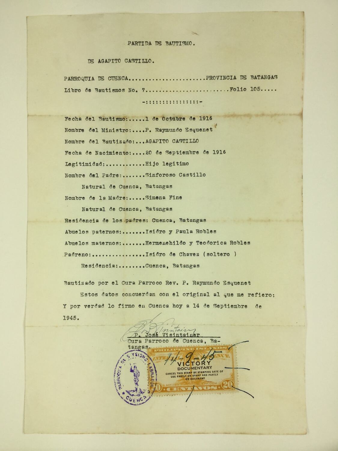Baptism certificate in Spanish language for Agapito Castillo signed by P.Jose Visintainer, Parish Priest of Cuenca Batangas in the Philippines where Agapito was born on 20 September 1916. The baptism date was 1 October 1916. The certificate lists Agapito's family details including his parents and grandparents. The document relates to HT 57760 baptism certificate produced in English by St Francis Church Melbourne and it was likely part of gathering documentation required for their marriage in 1945.