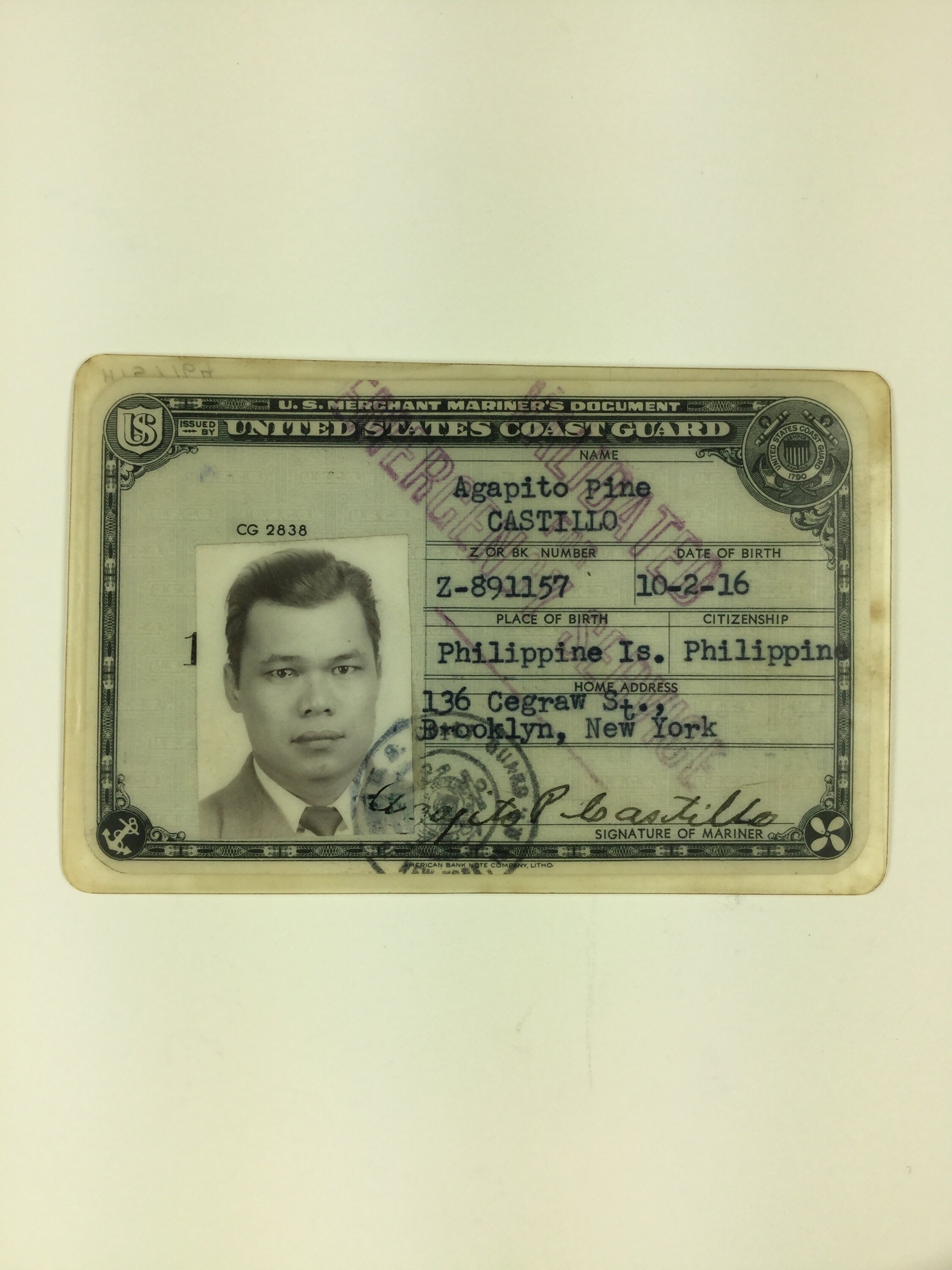 Identity card or union card issued to Agapito Castillo by the United States Coastguard in his position as a seaman, dated 22 April, 1952. It lists Agapito's address as Brooklyn, New York, and his place of birth and citizenship as the Philippines. Around this time Agapito was trying to gain permission to re-enter Australia to visit his wife and children in Melbourne.