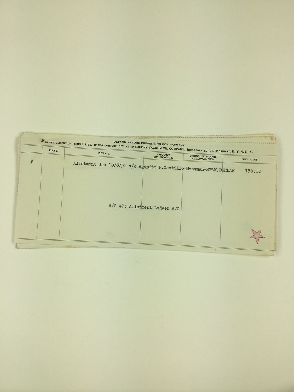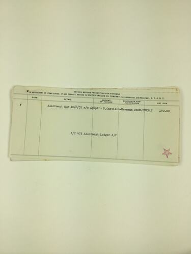 Seven seamans' allotment notes or pay slips (originally pinned together) which lists Agapito Castillo as the allotter payable to the amount of $150 US dollars. It lists Agapito on board the ship SS Stan Durban and the payee as Socony Vacuum Oil Company, New York, USA. The notes record monthly payments from 8 October 1951 to 8 April 1952. Around this time Agapito was trying to gain permission to re-enter Australia to visit his wife and children in Melbourne. Since Agapito was unable to catch a freighter back to Australia, the payments were all given to Aileen who saved them, and when Agapito finally was able to return home they used these savings to purchase their first home in Carnegie where the family still reside.