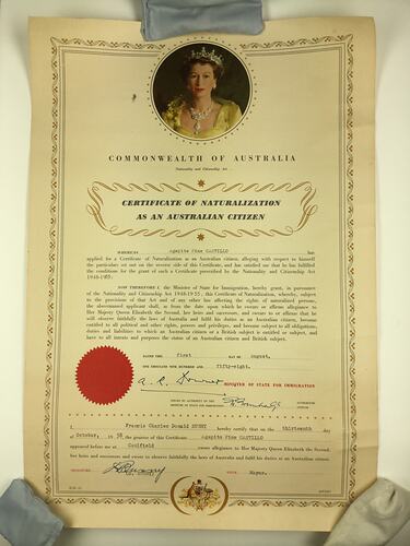 Large format certificate printed on thick cream paper, with typed black text, a red seal, decorative border and image of Queen Elizabeth II at the top. Typed text on reverse.