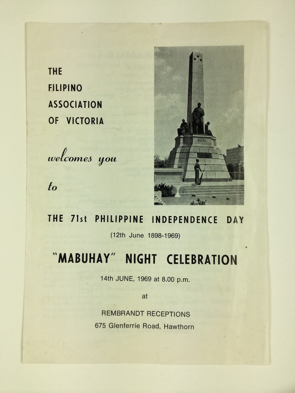 Program of the Filipino Association of Victoria for the 'Mabuhay' Night Celebration, 71st Philippine Independence Day, at Rembrandt Receptions, 675 Glenferrie Road Hawthorn. The program includes a fashion parade, folk dances, and the Philippine National Anthem. Guests of honour included Archbishop Dr J.R. Knox and Victorian Minister and Mrs J.W. Manson.