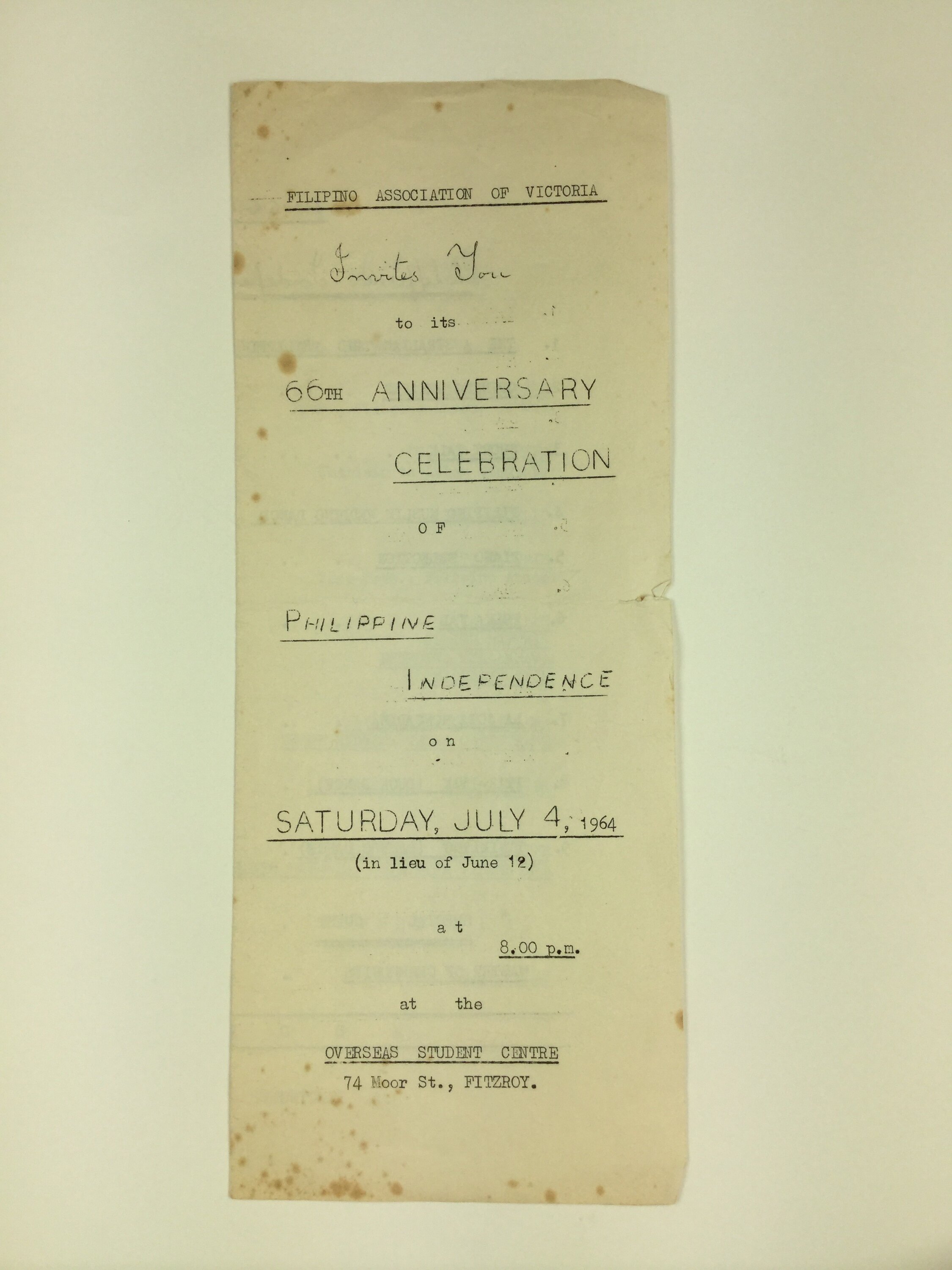 Program for the 66th Anniversary Celebration of Philippine Independence Day on 4 July, 1964 for the Filipino Association of Victoria at the Overseas Student Centre, 74 Moor Street, Fitzroy on 7 July, 1962. The program included national anthems, speeches, traditional music and dances