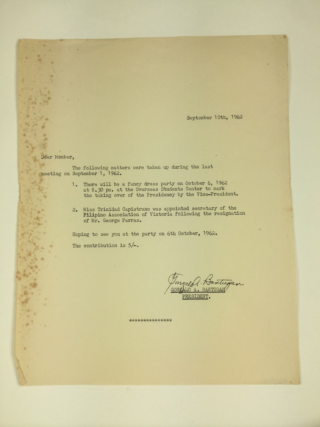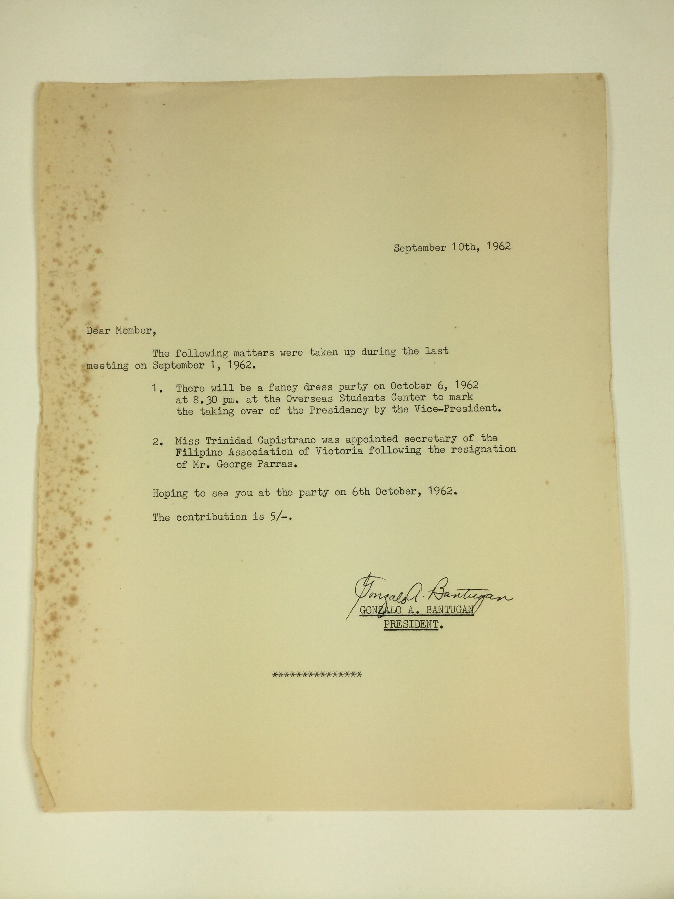 Letter reporting on a series of outcomes from a meeting of the Filipino Association of Victoria held on 1 September, 1962. The letter is dated 10 September, 1962 and is from the President, G.A. Bantugan.