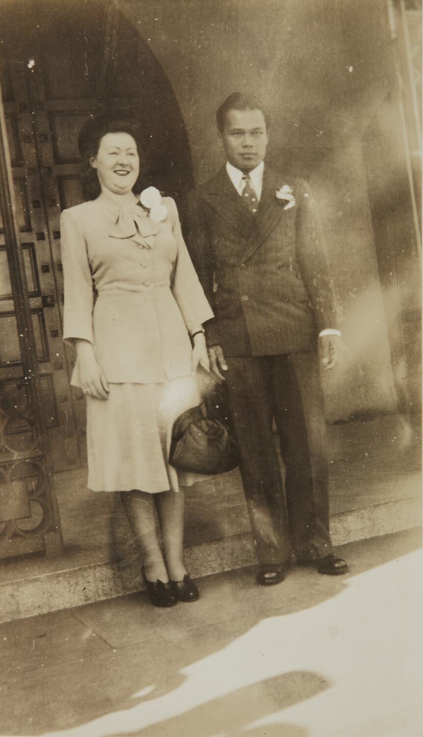 Digital photograph of Aileen McColl and Agapito Castillo outside the entrance to St Patrick's Cathedral, Melbourne on their wedding day, September, 1945. Philippines-born Agapito Castillo had married Aileen McColl in Melbourne while he was working for the British Phosphate Company and was detained there during World War II.