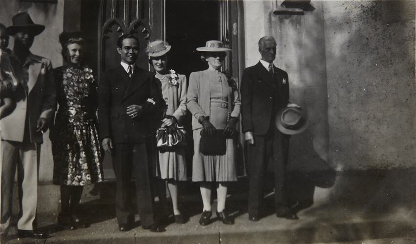 Digital photograph of Nance Bennett and Plutarco Agaton and their wedding party outside St Peter's church, Eastern Hill, Melbourne, Summer, 1944. From left to right: Conrad Santos (holding 15 months old Geoffrey, Olive Santos (nee Bennett), Plutarco Agaton, Nance Agaton (nee Bennett), William and Elizabeth Bennett (parents of Olive and Nance). The Agatons and Santos' were friends of Agapito and Aileen Castillo and part of a community of men from the Philippines who married local Australian women during World War II.
