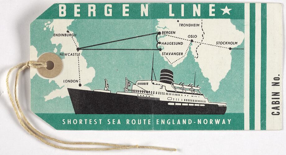 front printed text:BERGEN LINE/EDINBURGH NEWCASTLE LONDON BERGEN TRONDHIEM OSLO HUAGSUND STAVANGER STOCKHOLM/SHORTEST SEA ROUTE ENGLAND-NORWAY/ CABIN No. rear printed text: Via Newcastle, TYNE COMMISSION QUAY/Vessel Date of Sailing/ Passanger's Name/Address/Destination Port/Cabin No./Printed in England/LF.572(E)