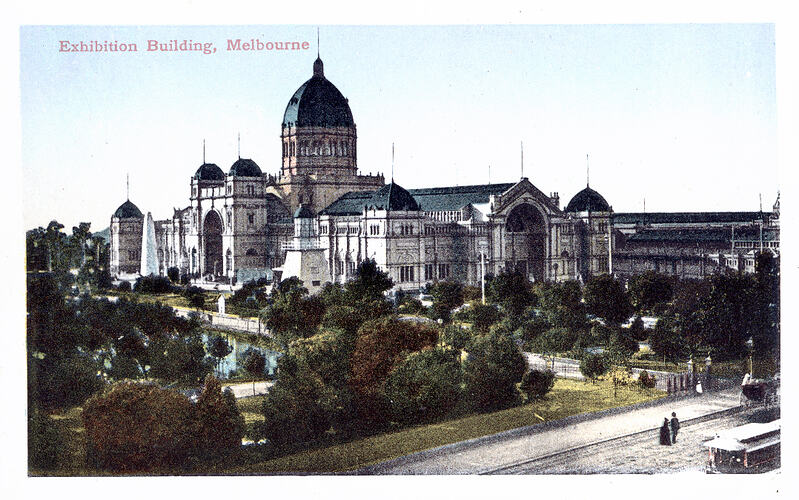 A colour tinted photograph of the Exhibition Building, gardens and part of Nicholson Street showing tram, people and carriage. The photograph has been taken from an elevated position on Nicholson Street with a view of the south east facade in the background. The lake, gardens and road are in the foreground. An obelisk and lighthouse structure are to the south of the building and annexes appear at the north side of the building. On the reverse of the card there is space to write a message, an address and to place a stamp. The card is unused.