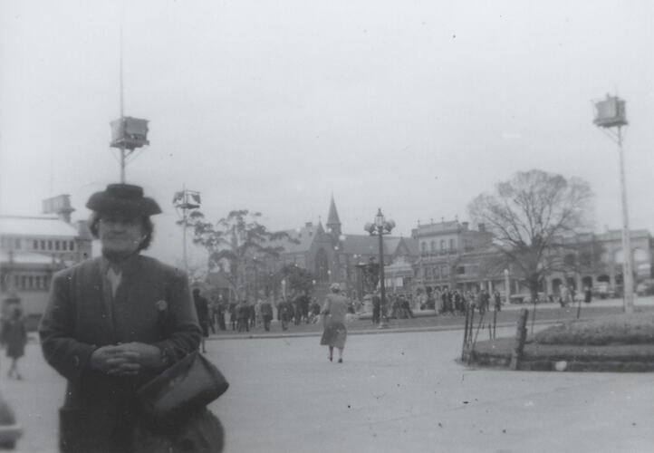 Garden area at the eastern entrance to the Exhibition Building. In the foreground, a woman is posing for the camera wearing a winter coat and hat with a handbag over her arm. In the background, a group of people are gathered on the lawn watching a pole-sitting competition. Three pole-sitters are competing. In the background, buildings along Nicholson Street and on the right hand side, part of the ballroom at the Exhibition Building is visible.