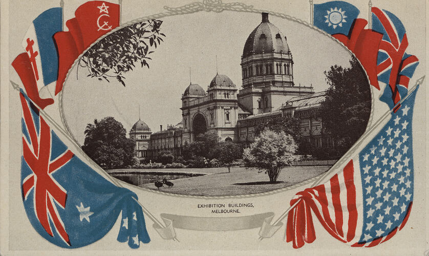 Buildings, Civic Mementoes, Exterior Views, Flags, Postcards, Royal Exhibition Building, Souvenirs, World War II, 1939-1945