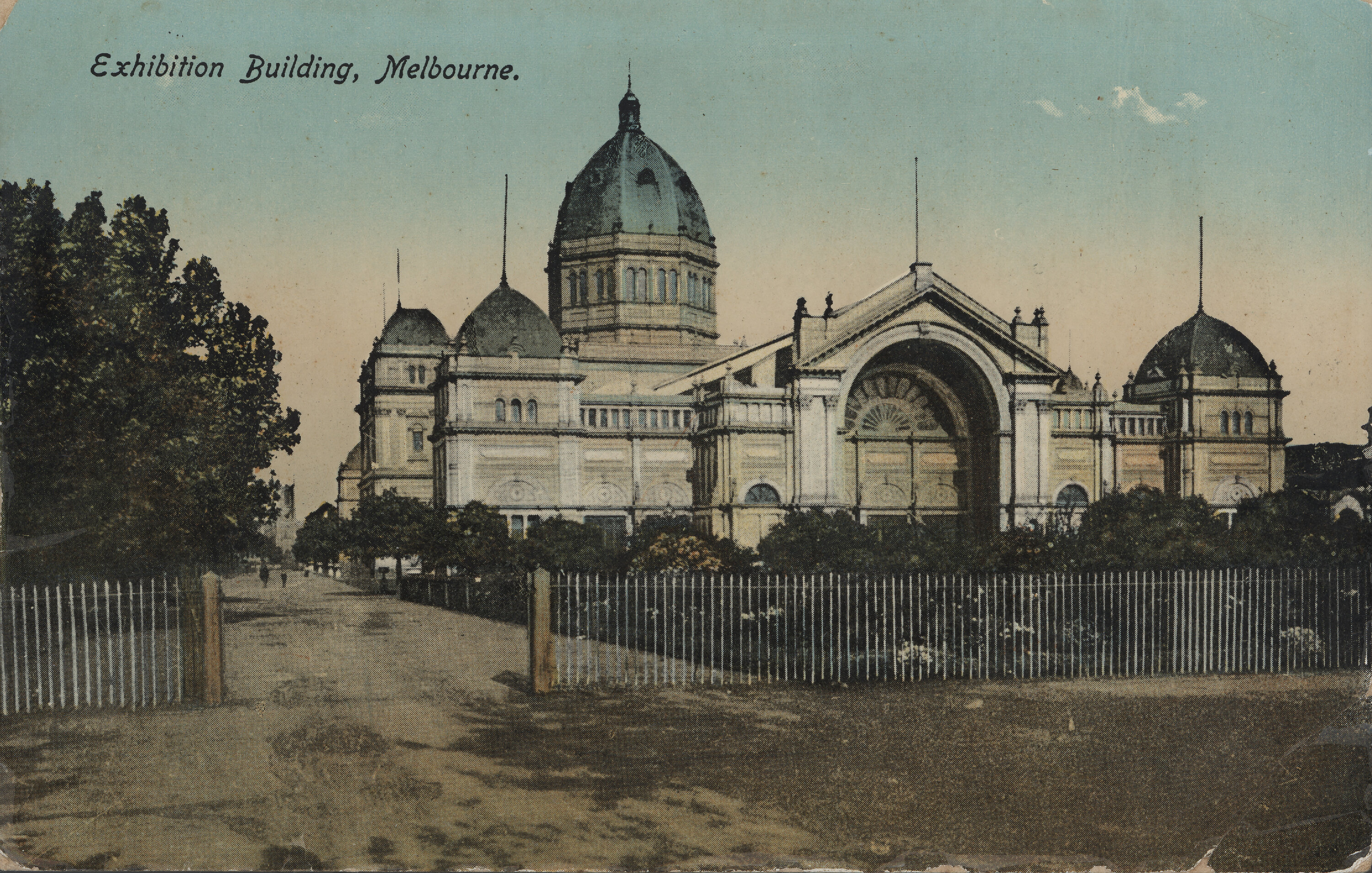 A colour tinted photograph of the Exhibition Building showing the eastern facade, southern driveway, garden beds and trees with a fence in the foreground. On the reverse of the card there is space to write a message, an address and to place a stamp. The card is unused.