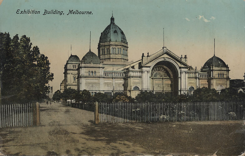 The Exhibition Building was built for the 1880 Melbourne International Exhibition, which opened to visitors on 1 October 1880. On 9 May 1901, it hosted the opening of the First Commonwealth Parliament of Australia. By the early 20th century, picture postcards of the Exhibition Building were a popular Melbourne souvenir.
