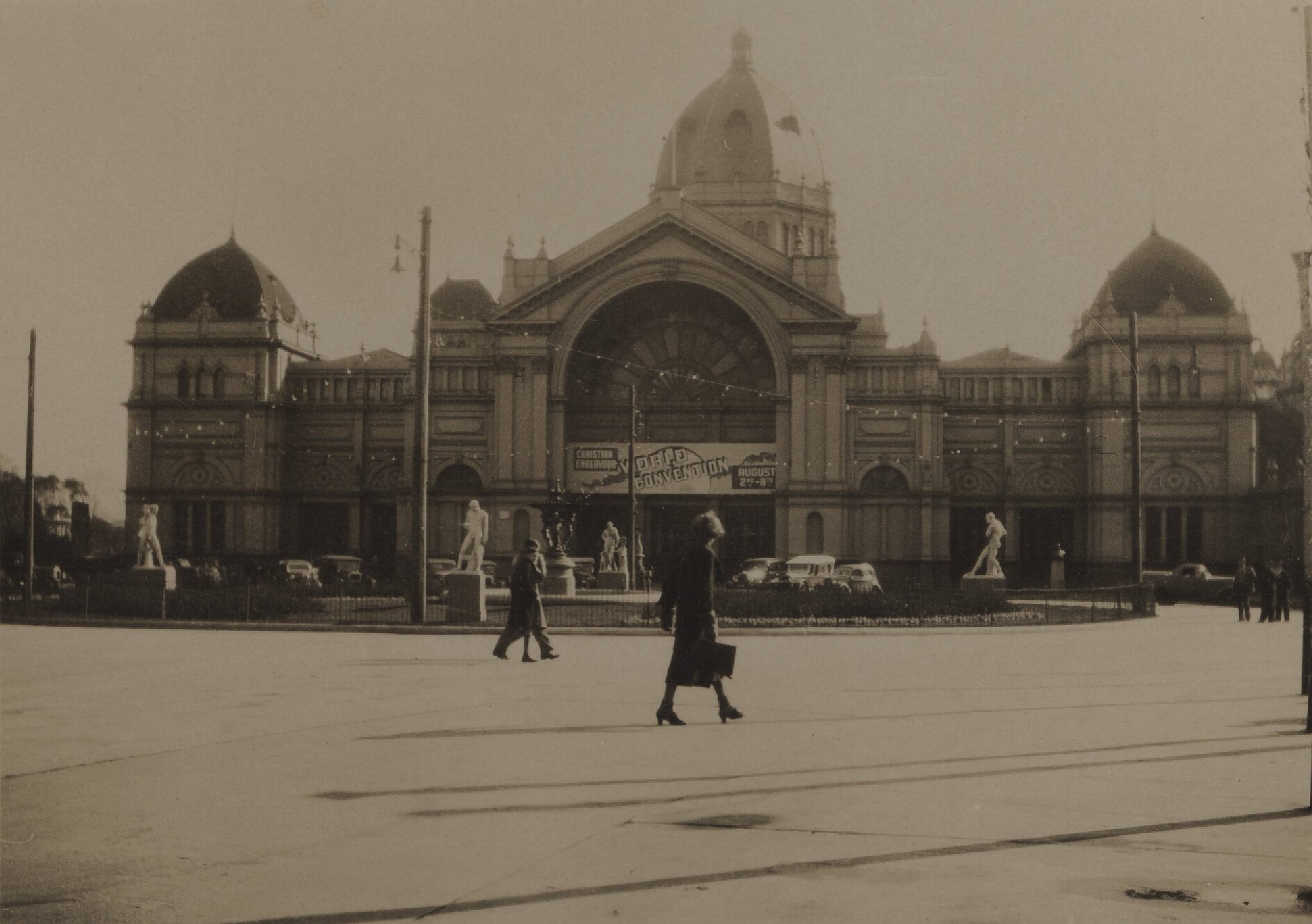 Photograph of the Exhibition Building, Melbourne, in early August 1938. There is a banner for the Christian Endeavour, World Convention which was held at the building from 2- 8 August 1938.