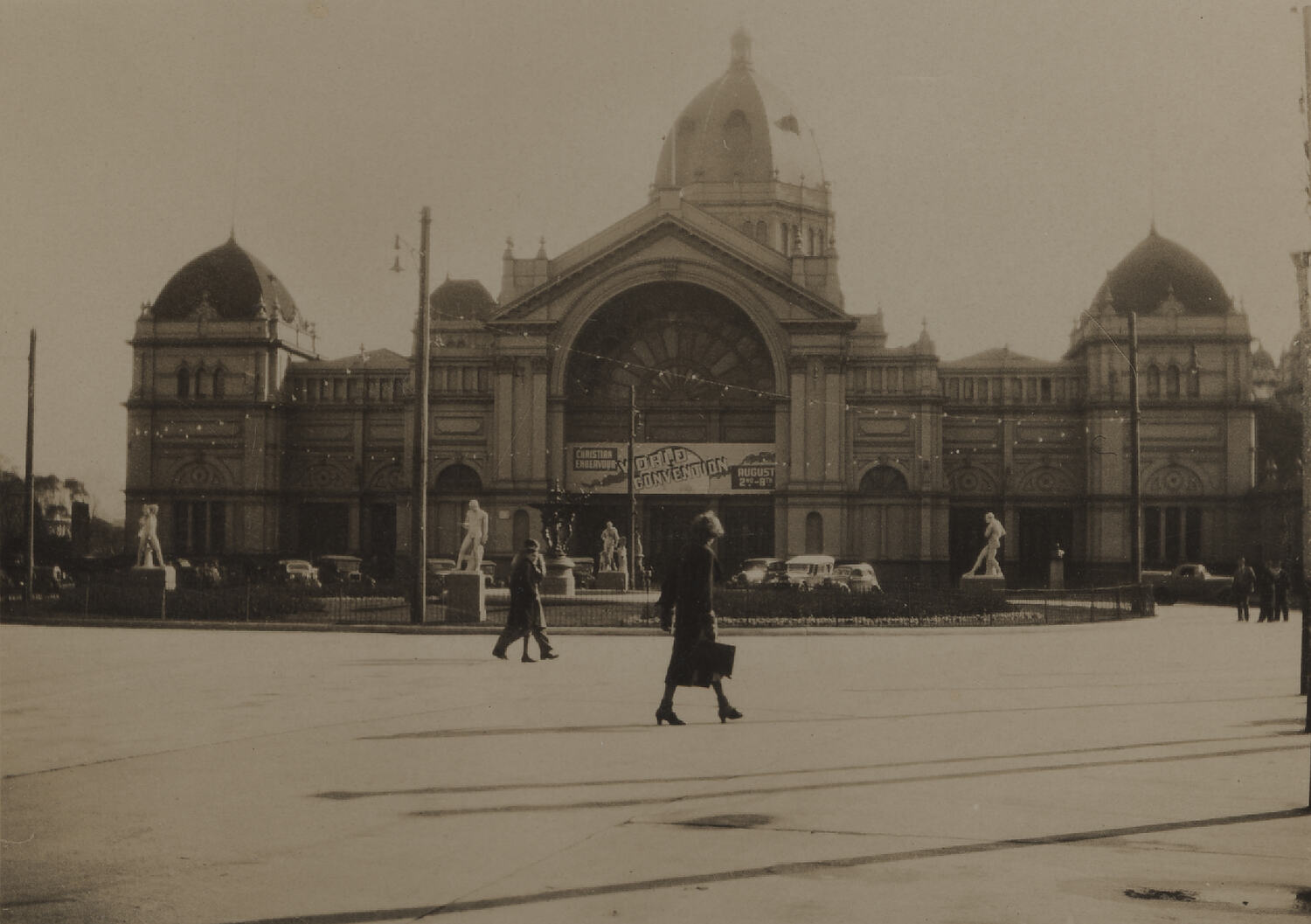 Exhibition Building from the East, statues, pedestrians and road visible. Banner over entrance reads: Christian Endeavour, World Convention, August 2nd - 8th, 1938.