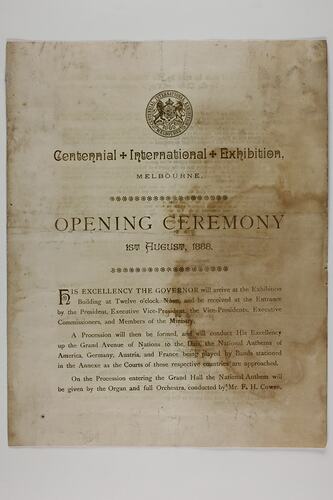 Programme for the Opening Ceremony of the Melbourne Centennial International Exhibition, held in the (Royal) Exhibition Building on 1 August 1888. The programme includes arrangements for the Governor's arrival, the prayers recited, a program of music with the names of the composer, conductor, soloists etc., and words to the Centennial Cantata.