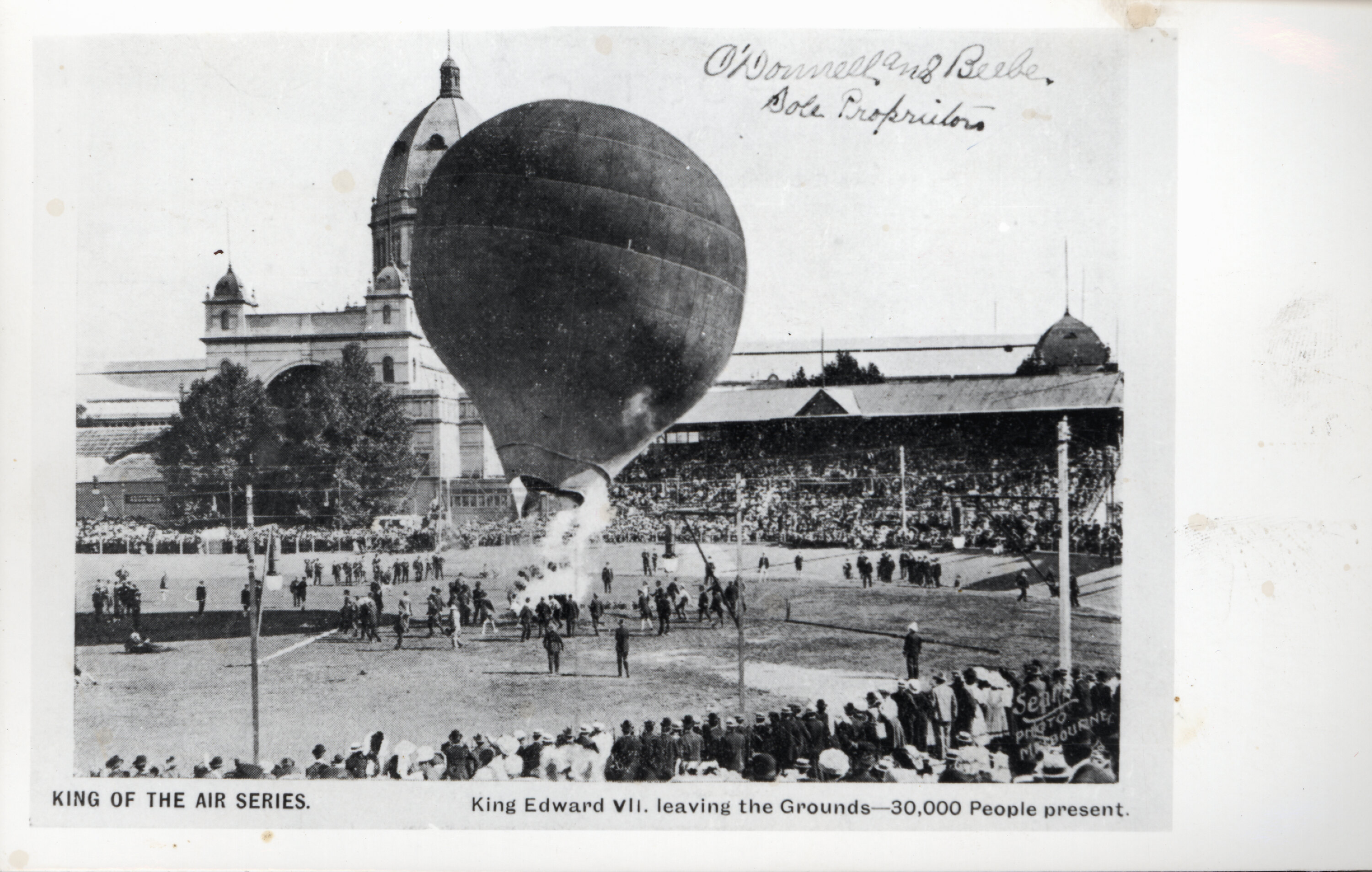 Printed on Front: KING OF THE AIR SERIES / King Edward VII leaving the Grounds - 30,000 People present. Handwritten on Front: O'Donnell and Beebe / Sole Proprietors On reverse, handwritten in ink: John 79.