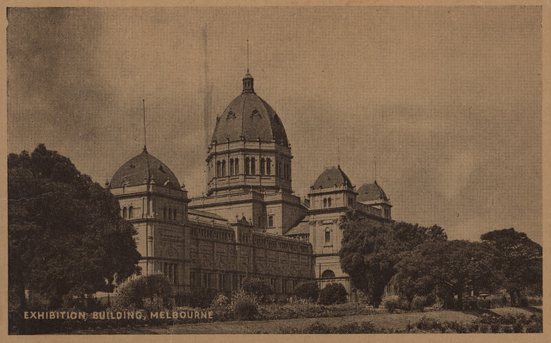 The Exhibition Building was built for the 1880 Melbourne International Exhibition, which opened to visitors on 1 October 1880. On 9 May 1901, it hosted the opening of the First Commonwealth Parliament of Australia. By the early 20th century, picture postcards of the Exhibition Building were a popular Melbourne souvenir.