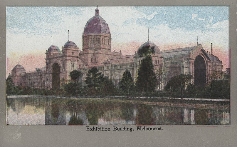 The Exhibition Building was built for the 1880 Melbourne International Exhibition, which opened to visitors on 1 October 1880. On 9 May 1901, it hosted the opening of the First Commonwealth Parliament of Australia. By the early 20th century, picture postcards of the Exhibition Building were a popular Melbourne souvenir.