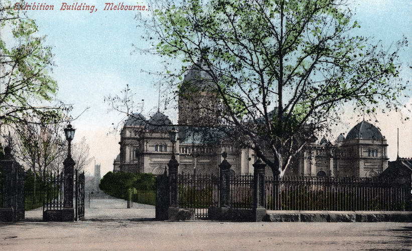 This is a colour postcard of the Exhibition Building showing the eastern facade and southern driveway with an iron fence in the foreground, circa 1910. The postcard, which is unused, was printed in Great Britain.