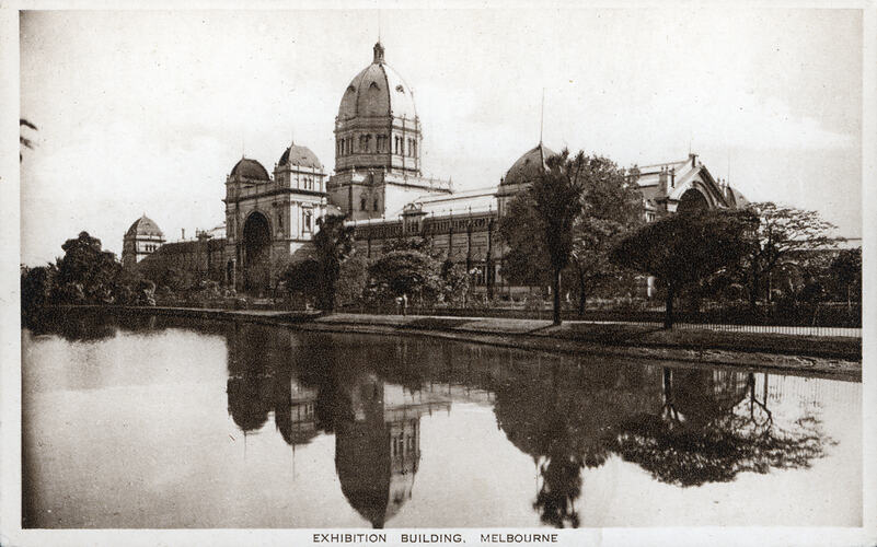 The Exhibition Building was built for the 1880 Melbourne International Exhibition, which opened to visitors on 1 October 1880. By the early 20th century, picture postcards of the Exhibition Building were a popular Melbourne souvenir.