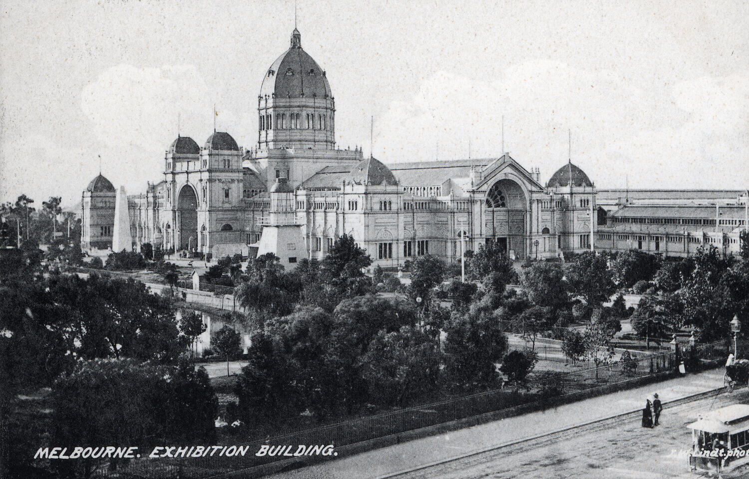 A black & white photograph of the Exhibition Building, gardens and part of Nicholson Street showing tram, people and carriage. Photograph taken from an elevated position in Nicholson Street with a view of the south east facade in the background. The lake and gardens are in the immediate foreground as well as the obelisk and lighthouse structure immediately south of the building. Annexes appear at the north side of the building. The photographer was JW Lindt (1845-1926). On the reverse of the card there is space to write a message, an address and to place a stamp. The card is unused.